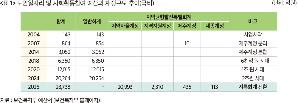 ◎ 노인일자리사업의 회계단위가 보건복지부 일반회계에서 기획예산처 지역균형발전특별회계로 전환되면서 잠재된 재정쟁점과 사업 운영 개선과제를 제시함