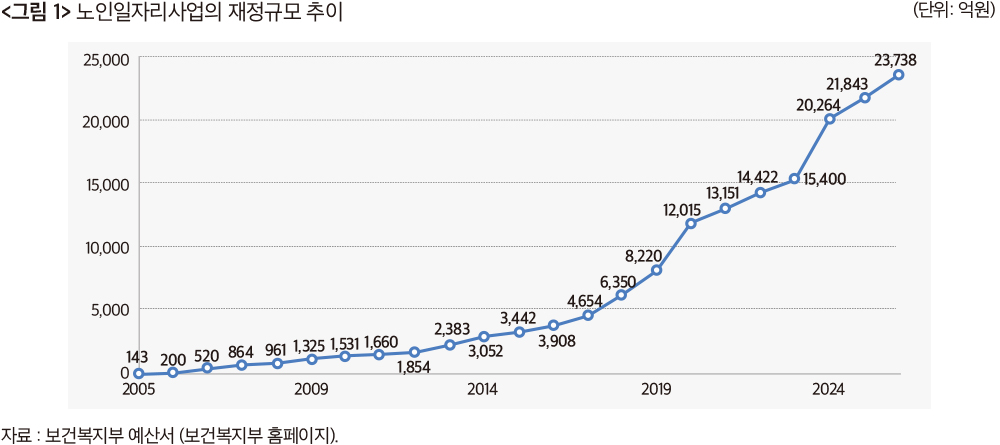 정부의 노인일자리 사업이 공식 출범한 첫해인 2004년 예산은 일반회계(국비) 143억 원이었고 일자리 창출은 25,127개였다. 이후 예산과 일자리 규모는 급증했다. 2026년 노인일자리사업의 국비예산은 2.4조 원이며 100만 명 이상의 노인에 대한 보충급여와 일상생활에 영향을 미치는 대표 노인서비스이다. 고령사회 활동적 고령화를 위한 재정 사업은 여기에 집중돼 있다. 국고보조율이 50%(서울 30%)이기 때문에 올해 지방비를 포함한 총사업비는 5조 원 수준이고 115만 개 정도의 일자리 창출이 전망됐다.