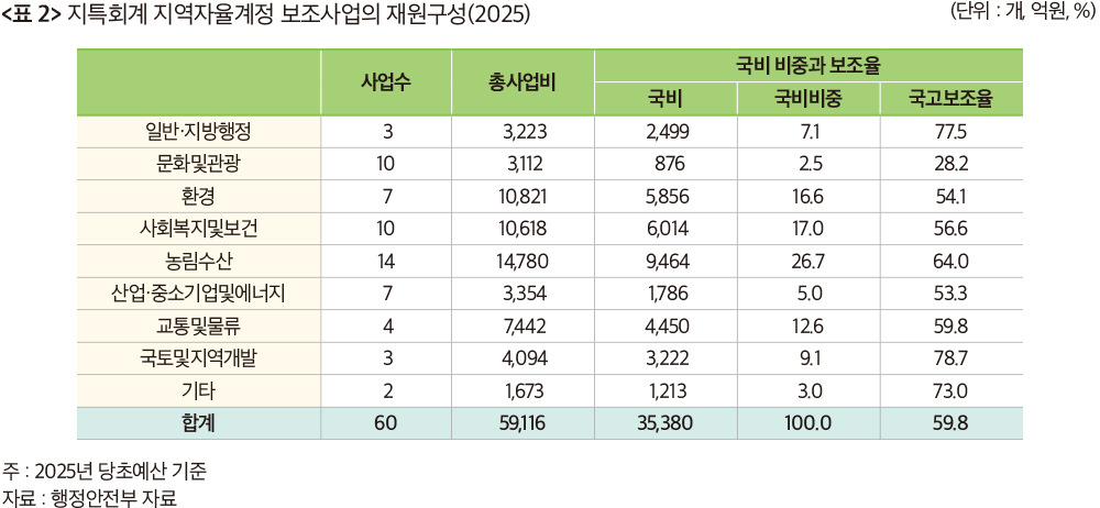 계정 사업의 재정기능은 다양하다. 문화관광, 농림어업, 교통, 환경, 복지 등과 같이 대부분의 재정기능이 있다. 재원경쟁의 결과는 지방의 재정거버넌스에 따라 다양하다. 노인일자리사업의 경우, 복지지출을 선호하는 지방정부는 유리하고 그렇지 않으면 불리하다. 2025년 당초예산에서 복지 및 보건의 비중은 17.0% 수준인데 보조율은 중간 수준이다. 보조율이 낮으면 지방비 부담이 높아 재원확보에 불리하다. 자체재원이 취약한 재정낙후지역의 경우 상대적으로 보조율이 높은 계정사업에 우선적으로 재원을 배분할 유인이 있기 때문이다.