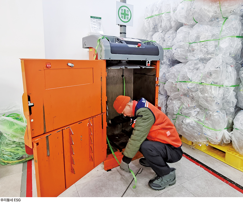• 이연숙 사회복지사 미추홀시니어클럽의 ‘미추홀구 우리동네 ESG’ 사업은 미추홀구 전역에 폐자원을 수거하고 자원화하는 지역완결형 자원순환 모델입니다. 만 60세 이상 어르신들이 참여하시며, 자원의 특성에 따라 맞춤형 공정을 운영합니다. 가장 핵심인 투명 페트병은 고품질 재생원료로 ‘우리동네자원순환단’이 수거한 페트병은 세척과 건조 과정을 거쳐 재생을 완료하고 이를 활용해서 제작된 재생장갑 등은 다시 지역 주민들이 사용하게 합니다. 그 외의 다양한 재활용 자원들은 체계적으로 수거하여 전문업체에 판매함으로써 관내 폐기물 처리 비용을 절감하고 있습니다. 이번 인터뷰의 주인공인 우리동네 ESG 사업단은 이렇게 모인 다양한 폐자원을 수집ㆍ이동시키고 부피를 줄여 판매 가능한 상태로 압축하는 핵심 물류와 판매 역할을 담당하고 있습니다.